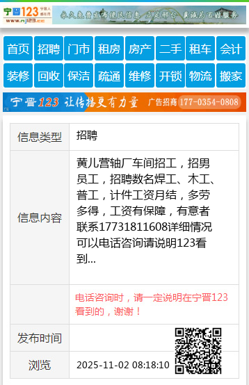 黄儿营轴厂车间招工,招男员工,招聘数名焊工、木工、普工,计件工资月结,多劳多得,工资有保障,有意者联系17731811608
