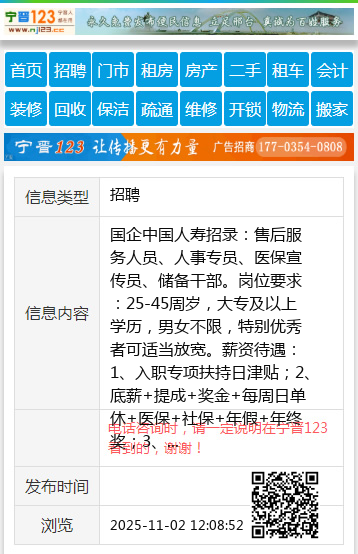 国企中国人寿招录:售后服务人员、人事专员、医保宣传员、储备干部。 岗位要求:25-45周岁,大专及以上学历,男女不限,特别优秀者可适当放宽。 薪资待遇:1、入职专项扶持日津贴;2、底薪+提成+奖金+每周日单休+医保+社保+年假+年终奖;3、6小时工作制,不影响接送孩子;4、提供学习资源、内外部成长培训机遇,无限成长空间;5、常白班,办公室工作,提供工位。 工作地址:宁晋县吉祥路(西二环)与晶龙街交叉口西南角-中国人寿。 联系电话:13784925906微信同号。 |