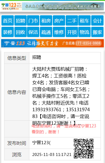 大陆村大贾线机械厂招聘:焊工4名;工资很高!质检女4名;发货客服4名女已婚已育会电脑;车间女工5名;机械手操作工5名;零活工2名;大陆村附近优先!电话13931933761;13513197483 【电话咨询时,请一定说明在宁晋123看到的,谢谢!】 |