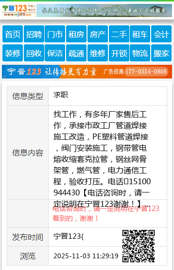 找工作,有多年厂家售后工作,承接市政工厂管道焊接施工改造,PE塑料管道焊接,阀门安装施工,钢带管电熔收缩套克拉管,钢丝网骨架管,燃气管,电力通信工程,验收打压。电话15100944430