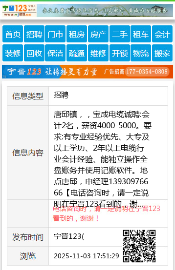 唐邱镇,,宝成电缆诚聘:会计2名,薪资4000-5000。要求:有专业经验优先、大专及以上学历、2年以上电缆行业会计经验、能独立操作全盘账务并使用记账软件。地点唐邱,申经理13930976666 【电话咨询时,请一定说明在宁晋123看到的,谢谢!】 |