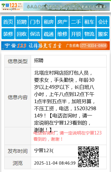 北塔庄村网店招打包人员,要求女,手头勤快,年龄30岁以上49岁以下,长白班八小时,上午八点到12点下午1点半到五点半,加班另算,不压工资,电话,15203298149! 【电话咨询时,请一定说明在宁晋123看到的,谢谢!】 |