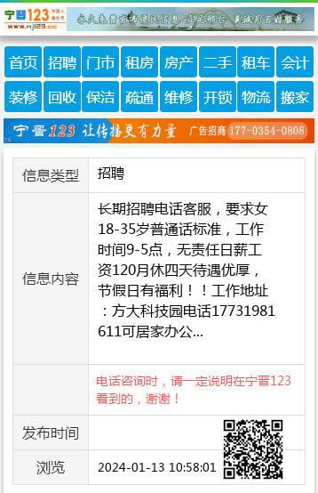 长期招聘电话客服,要求女18-35岁普通话标准,工作时间9-5点,无责任日薪工资120月休四天待遇优厚,节假日有福利!!工作地址:方大科技园电话17731981611可居家办公 【电话咨询时,请一定说明在宁晋123看到的,谢谢!】 |