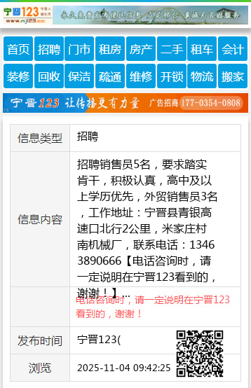 招聘销售员5名,要求踏实肯干,积极认真,高中及以上学历优先,外贸销售员3名,工作地址:宁晋县青银高速口北行2公里,米家庄村南机械厂,联系电话:13463890666 【电话咨询时,请一定说明在宁晋123看到的,谢谢!】 |