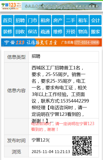 西城区工厂招聘普工1名,要求,25-55周岁。销售一名,要求25-35周岁,电工一名,要求有电工证,相关3年以上工作经验。工资面议,联系方式:15354442299柳经理 【电话咨询时,请一定说明在宁晋123看到的,谢谢!】 |