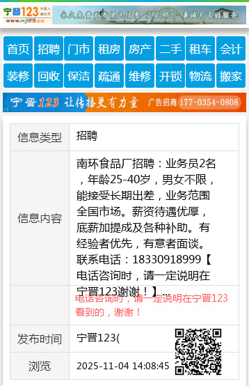 南环食品厂招聘:业务员2名,年龄25-40岁,男女不限,能接受长期出差,业务范围全国市场。薪资待遇优厚,底薪加提成及各种补助。有经验者优先,有意者面谈。联系电话:18330918999 【电话咨询时,请一定说明在宁晋123看到的,谢谢!】 |