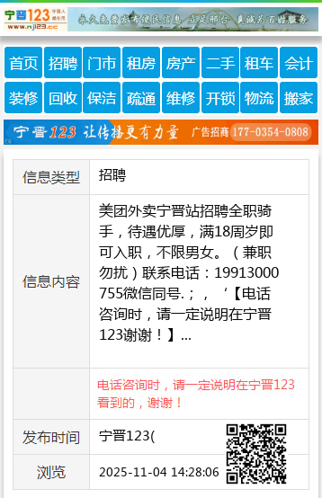 美团外卖宁晋站招聘全职骑手,待遇优厚,满18周岁即可入职,不限男女。(兼职勿扰)联系电话:19913000755微信同号.;,‘ 【电话咨询时,请一定说明在宁晋123看到的,谢谢!】 |