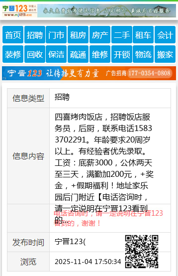 四喜烤肉饭店,招聘饭店服务员,后厨,联系电话15833702291。年龄要求20周岁以上。有经验者优先录取。工资:底薪3000,公休两天至三天,满勤加200元,+奖金,+假期福利!地址家乐园后门附近 【电话咨询时,请一定说明在宁晋123看到的,谢谢!】 |