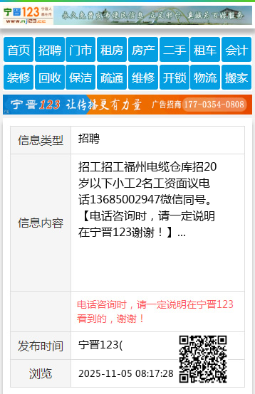 招工招工福州电缆仓库招20岁以下小工2名工资面议电话13685002947微信同号。