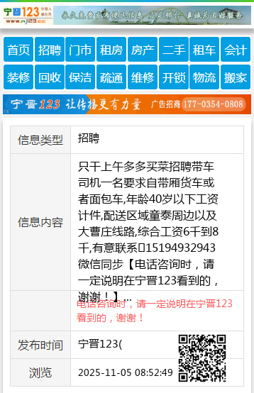 只干上午多多买菜招聘带车司机一名要求自带厢货车或者面包车,年龄40岁以下工资计件,配送区域童泰周边以及大曹庄线路,综合工资6千到8千,有意联系15194932943微信同步 【电话咨询时,请一定说明在宁晋123看到的,谢谢!】 |