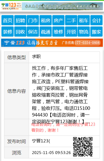 找工作,有多年厂家售后工作,承接市政工厂管道焊接施工改造,PE塑料管道焊接,阀门安装施工,钢带管电熔收缩套克拉管,钢丝网骨架管,燃气管,电力通信工程,验收打压。电话15100944430 【电话咨询时,请一定说明在宁晋123看到的,谢谢!】 |