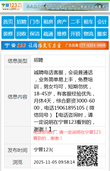 诚聘电话客服,会说普通话,业务简单易上手,免费培训,男女均可,短期勿扰,18-45岁,有客服经验优先,月休4天,综合薪资3000-6000,电话19061895105(微信同号) 【电话咨询时,请一定说明在宁晋123看到的,谢谢!】 |