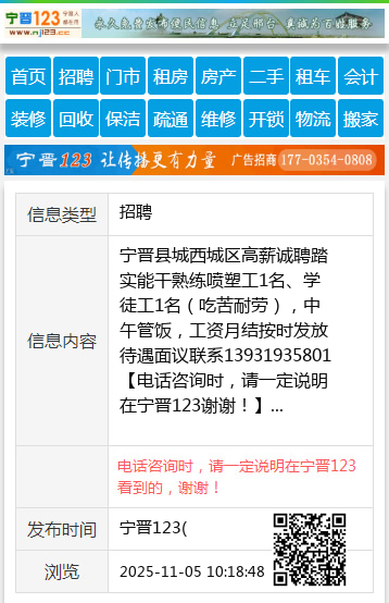 宁晋县城西城区高薪诚聘踏实能干熟练喷塑工1名、学徒工1名(吃苦耐劳),中午管饭,工资月结按时发放待遇面议联系13931935801 【电话咨询时,请一定说明在宁晋123看到的,谢谢!】 |