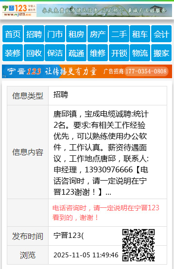 唐邱镇,宝成电缆诚聘:统计2名。要求:有相关工作经验优先,可以熟练使用办公软件,工作认真。薪资待遇面议,工作地点唐邱,联系人:申经理,13930976666 【电话咨询时,请一定说明在宁晋123看到的,谢谢!】 |