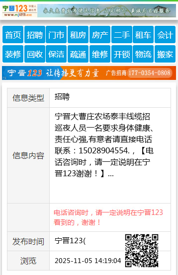 宁晋大曹庄农场泰丰线缆招巡夜人员一名要求身体健康、责任心强,有意者请直接电话联系:15028904554.,