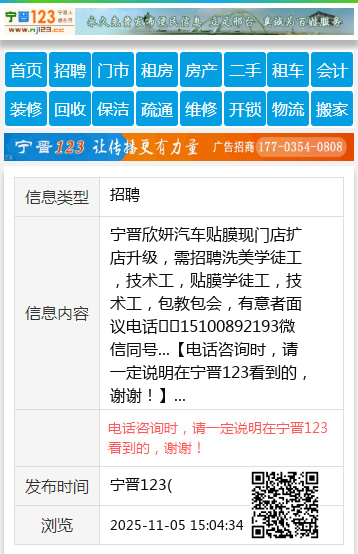 宁晋欣妍汽车贴膜现门店扩店升级,需招聘洗美学徒工,技术工,贴膜学徒工,技术工,包教包会,有意者面议电话☎️15100892193