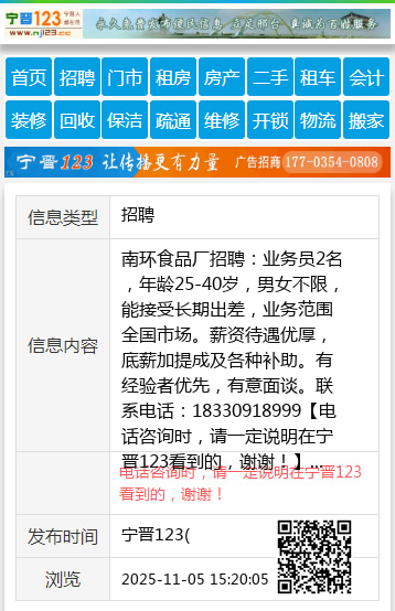 南环食品厂招聘:业务员2名,年龄25-40岁,男女不限,能接受长期出差,业务范围全国市场。薪资待遇优厚,底薪加提成及各种补助。有经验者优先,有意面谈。联系电话:18330918999 【电话咨询时,请一定说明在宁晋123看到的,谢谢!】 |