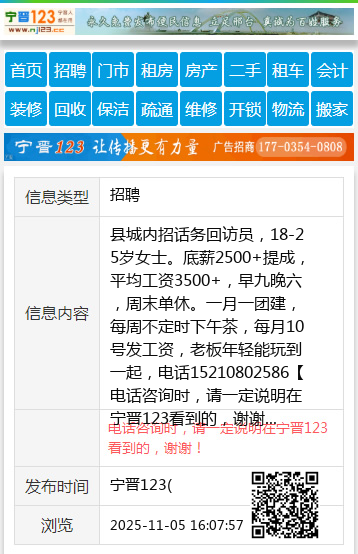县城内招话务回访员,18-25岁女士。底薪2500+提成,平均工资3500+,早九晚六,周末单休。一月一团建,每周不定时下午茶,每月10号发工资,老板年轻能玩到一起,电话15210802586 【电话咨询时,请一定说明在宁晋123看到的,谢谢!】 |