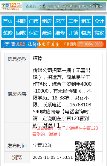传媒公司招募主播(无需出镜),招运营。简单易学工作轻松,综合工资到手4000-10000,有无经验都可,不限学历。18-38岁,男女不限。联系电话:16768108540微信同号 【电话咨询时,请一定说明在宁晋123看到的,谢谢!】 |