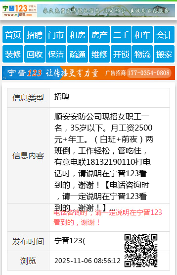 顺安安防公司现招女职工一名,35岁以下。月工资2500元+年工。(白班+前夜)两班倒,工作轻松,管吃住,有意电联18132190110