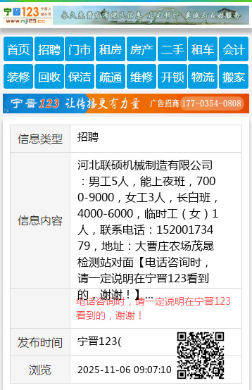 河北联硕机械制造有限公司:男工5人,能上夜班,7000-9000,女工3人,长白班,4000-6000,临时工(女)1人,联系电话:15200173479,地址:大曹庄农场茂晟检测站对面 【电话咨询时,请一定说明在宁晋123看到的,谢谢!】 |