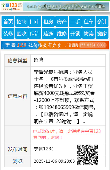 宁晋光良酒招聘:业务人员十名,《有酒类或快消品销售经验者优先》,业务工资底薪4000元➕提成.绩效.奖金-12000上不封顶。联系方式:张19948065999微信同号。, 【电话咨询时,请一定说明在宁晋123看到的,谢谢!】 |