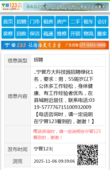 ..宁晋方大科技园招聘绿化1名,要求:男,55周岁以下,公休多工作轻松,身体健康、有工作经验者优先,在县城附近居住,联系电话:0319-577776715100932009 【电话咨询时,请一定说明在宁晋123看到的,谢谢!】 |