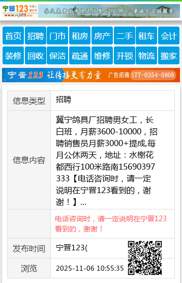 冀宁鸽具厂招聘男女工,长白班,月薪3600-10000,招聘销售员月薪3000+提成,每月公休两天,地址:水榭花都西行100米路南15690397333 【电话咨询时,请一定说明在宁晋123看到的,谢谢!】 |