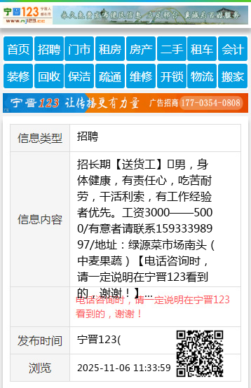 招长期【送货工】男,身体健康,有责任心,吃苦耐劳,干活利索,有工作经验者优先。工资3000——5000/有意者请联系15933398997/地址:绿源菜市场南头(中麦果蔬) 【电话咨询时,请一定说明在宁晋123看到的,谢谢!】 |