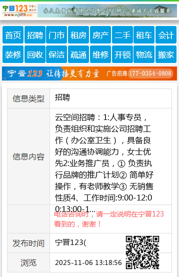 云空间招聘:1:人事专员,负责组织和实施公司招聘工作(办公室卫生),具备良好的沟通协调能力,女士优先