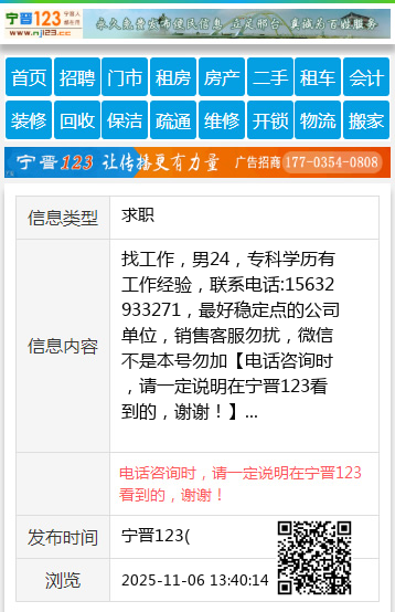找工作,男24,专科学历有工作经验,联系电话:15632933271,最好稳定点的公司单位,销售客服勿扰,微信不是本号勿加 【电话咨询时,请一定说明在宁晋123看到的,谢谢!】 |