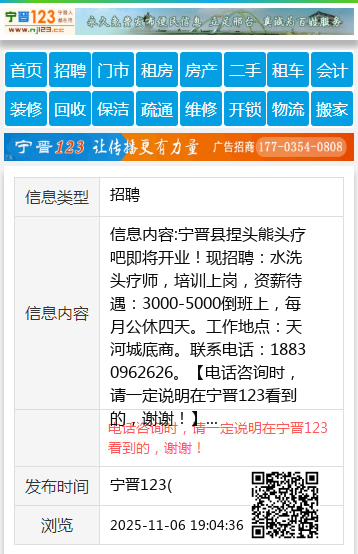 宁晋县捏头熊头疗吧即将开业!现招聘:水洗头疗师,培训上岗,资薪待遇:3000-5000倒班上,每月公休四天。工作地点:天河城底商。联系电话:18830962626。 【电话咨询时,请一定说明在宁晋123看到的,谢谢!】 |
