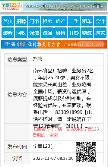 南环食品厂招聘:业务员2名,年龄25-40岁,男女不限,能接受长期出差,业务范围全国市场。薪资待遇优厚,底薪提成以及各种补助。有经验者优先,有意面谈。联系电话:18330918999 【电话咨询时,请一定说明在宁晋123看到的,谢谢!】 |