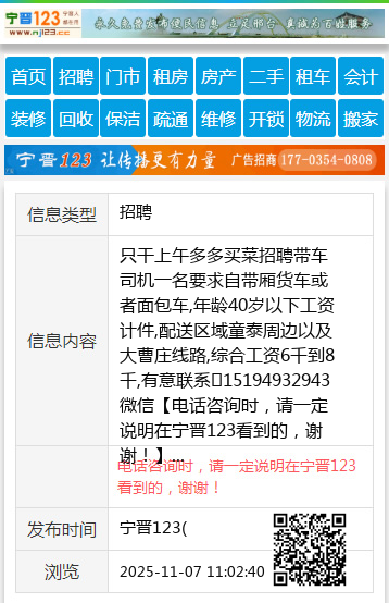 只干上午多多买菜招聘带车司机一名要求自带厢货车或者面包车,年龄40岁以下工资计件,配送区域童泰周边以及大曹庄线路,综合工资6千到8千,有意联系15194932943微信 【电话咨询时,请一定说明在宁晋123看到的,谢谢!】 |