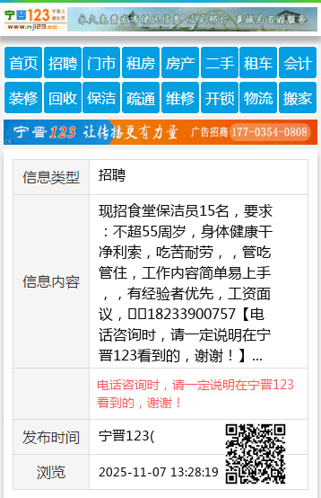 现招食堂保洁员15名,要求:不超55周岁,身体健康干净利索,吃苦耐劳,,管吃管住,工作内容简单易上手,,有经验者优先,工资面议,☎️18233900757 【电话咨询时,请一定说明在宁晋123看到的,谢谢!】 |