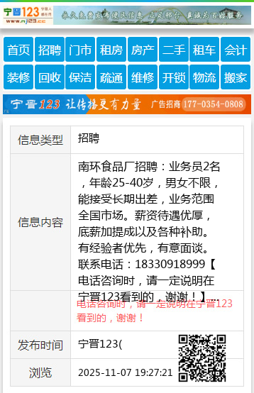 南环食品厂招聘:业务员2名,年龄25-40岁,男女不限,能接受长期出差,业务范围全国市场。薪资待遇优厚,底薪加提成以及各种补助。有经验者优先,有意面谈。联系电话:18330918999 【电话咨询时,请一定说明在宁晋123看到的,谢谢!】 |