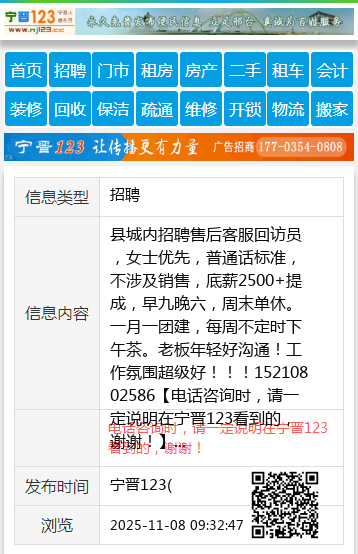县城内招聘售后客服回访员,女士优先,普通话标准,不涉及销售,底薪2500+提成,早九晚六,周末单休。一月一团建,每周不定时下午茶。老板年轻好沟通!工作氛围超级好!!!15210802586 【电话咨询时,请一定说明在宁晋123看到的,谢谢!】 |