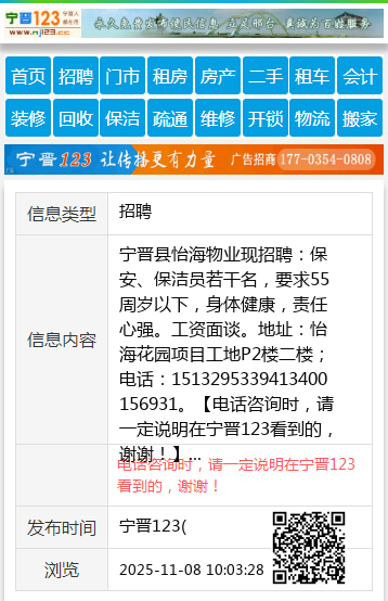 宁晋县怡海物业现招聘:保安、保洁员若干名,要求55周岁以下,身体健康,责任心强。工资面谈。地址:怡海花园项目工地P2楼二楼;电话:1513295339413400156931。 【电话咨询时,请一定说明在宁晋123看到的,谢谢!】 |