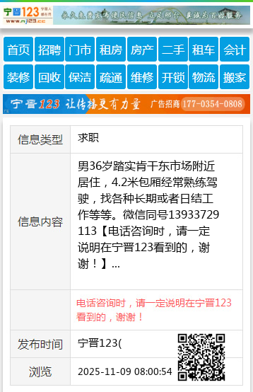 男36岁踏实肯干东市场附近居住,4.2米包厢经常熟练驾驶,找各种长期或者日结工作等等。微信同号13933729113 【电话咨询时,请一定说明在宁晋123看到的,谢谢!】 |