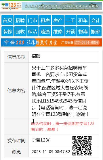 只干上午多多买菜招聘带车司机一名要求自带厢货车或者面包车,年龄40岁以下工资计件,配送区域大曹庄农场线路,综合工资5千到7千,有意联系15194932943微信同步 【电话咨询时,请一定说明在宁晋123看到的,谢谢!】 |