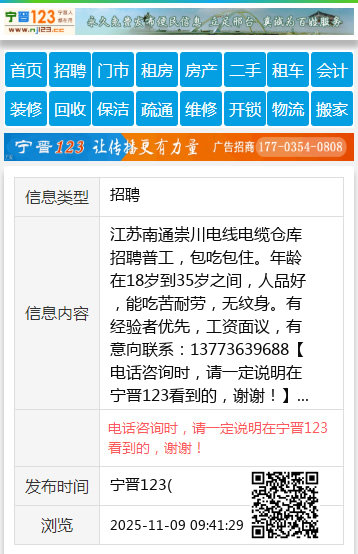 江苏南通崇川电线电缆仓库招聘普工,包吃包住。年龄在18岁到35岁之间,人品好,能吃苦耐劳,无纹身。有经验者优先,工资面议,有意向联系:13773639688 【电话咨询时,请一定说明在宁晋123看到的,谢谢!】 |