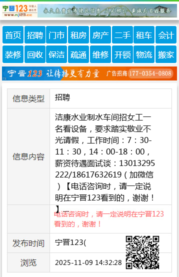 洁康水业制水车间招女工一名看设备,要求踏实敬业不光请假,工作时间:7:30-11:30,14:00-18:00,薪资待遇面试谈:13013295222/18617632619(加微信) 【电话咨询时,请一定说明在宁晋123看到的,谢谢!】 |