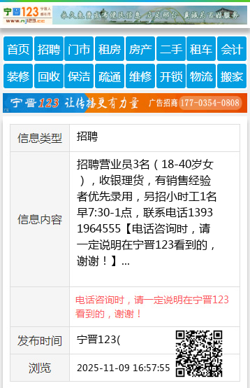 招聘营业员3名(18-40岁女),收银理货,有销售经验者优先录用,另招小时工1名早7:30-1点,联系电话13931964555 【电话咨询时,请一定说明在宁晋123看到的,谢谢!】 |