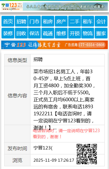 菜市场招1名男工人,年龄30-45岁,早上5点上班,首月工资4800,加全勤奖300,三个月入职后不低于5500。正式员工月均6000以上,离家远的有宿舍,联系电话18931922211 【电话咨询时,请一定说明在宁晋123看到的,谢谢!】 |