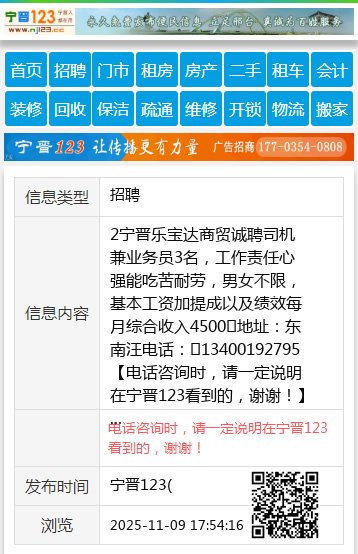 2宁晋乐宝达商贸诚聘司机兼业务员3名,工作责任心强能吃苦耐劳,男女不限,基本工资加提成以及绩效每月综合收入4500➕地址:东南汪电话:13400192795 【电话咨询时,请一定说明在宁晋123看到的,谢谢!】 |