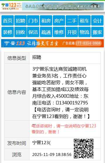 3宁晋乐宝达商贸诚聘司机兼业务员3名,工作责任心强能吃苦耐劳,男女不限,基本工资加提成以及绩效每月综合收入4500➕地址:东南汪电话:13400192795 【电话咨询时,请一定说明在宁晋123看到的,谢谢!】 |