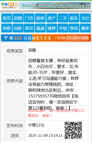 招聘童装主播,有经验者优先,小白也可,要求:女,年龄20-35岁,形象好,踏实上进,学习沟通能力强;有想法有能力想搞钱的。地址:颐和绿洲北区附近。详询:15175935770微信同号 【电话咨询时,请一定说明在宁晋123看到的,谢谢!】 |