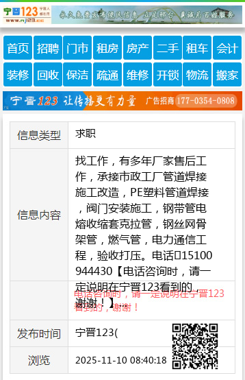 找工作,有多年厂家售后工作,承接市政工厂管道焊接施工改造,PE塑料管道焊接,阀门安装施工,钢带管电熔收缩套克拉管,钢丝网骨架管,燃气管,电力通信工程,验收打压。电话15100944430 【电话咨询时,请一定说明在宁晋123看到的,谢谢!】 |