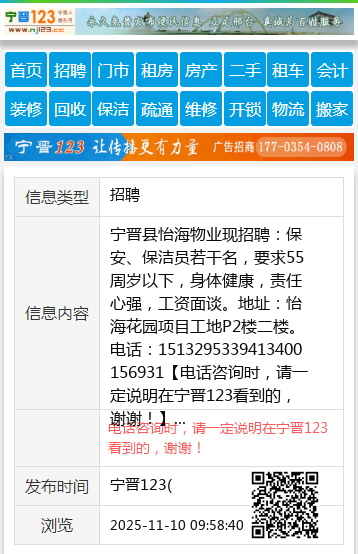 宁晋县怡海物业现招聘:保安、保洁员若干名,要求55周岁以下,身体健康,责任心强,工资面谈。地址:怡海花园项目工地P2楼二楼。电话:1513295339413400156931 【电话咨询时,请一定说明在宁晋123看到的,谢谢!】 |
