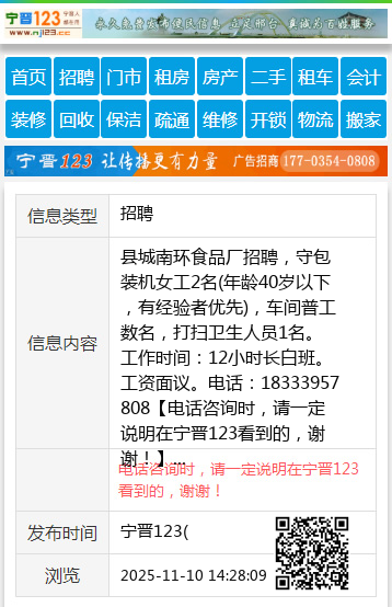 县城南环食品厂招聘,守包装机女工2名(年龄40岁以下,有经验者优先),车间普工数名,打扫卫生人员1名。工作时间:12小时长白班。工资面议。电话:18333957808 【电话咨询时,请一定说明在宁晋123看到的,谢谢!】 |